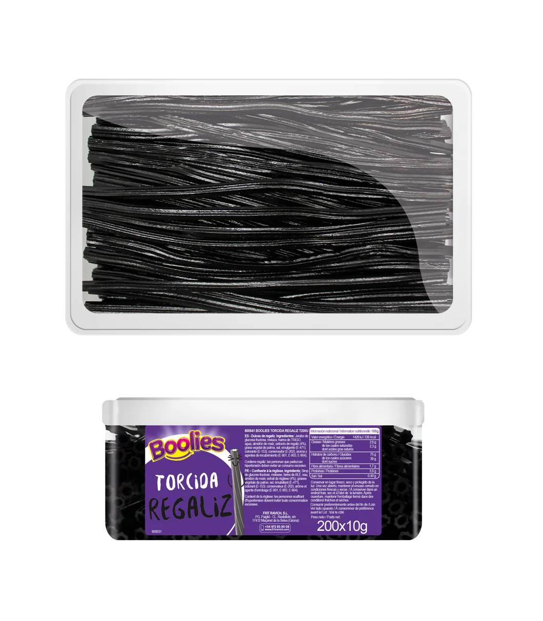 Los Boolies Torcida Regaliz son regalices que conquistan el paladar. Su textura blanda y masticable hace que cada mordisco sea una experiencia deliciosa. Presentadas en caja de 200 unidades.