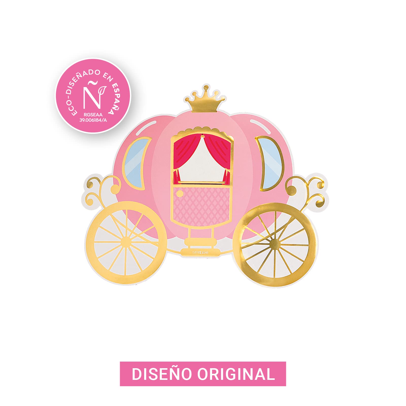 Piñata Princess de OHYEAH! en forma de carroza de princesa en tonos rosa y dorado. Su diseño elegante y brillante la convierte en el centro de atención, ideal para celebraciones temáticas de princesas o cuentos de hadas. Fabricada con cartón 100% reciclable, es una opción ecológica, segura y divertida para los más pequeños.